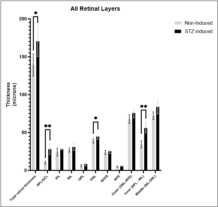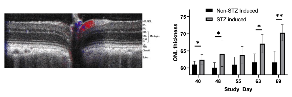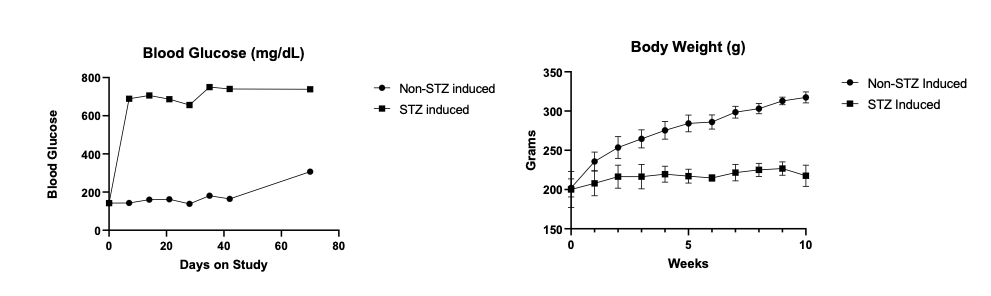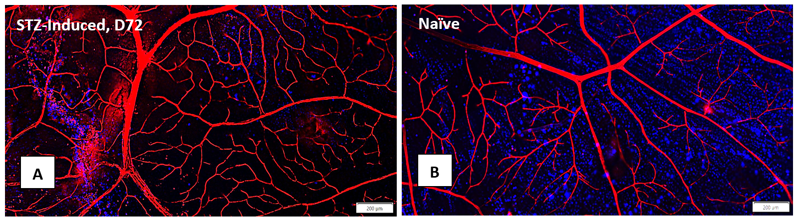 Elevated blood sugar levels, or hyperglycemia, trigger a cascade of detrimental effects, including oxidative stress, endothelial cell damage, and capillary occlusion. This leads to tissue hypoperfusion, elevated Vascular Endothelial Growth Factor (VEGF) levels, neovascularization, and complications like leakage and retinal edema in Diabetic Retinopathy (DR)1. Developing an animal model that accurately replicates the pathogenesis and endpoints of DR is essential for effectively evaluating potential therapeutics at various disease stages.