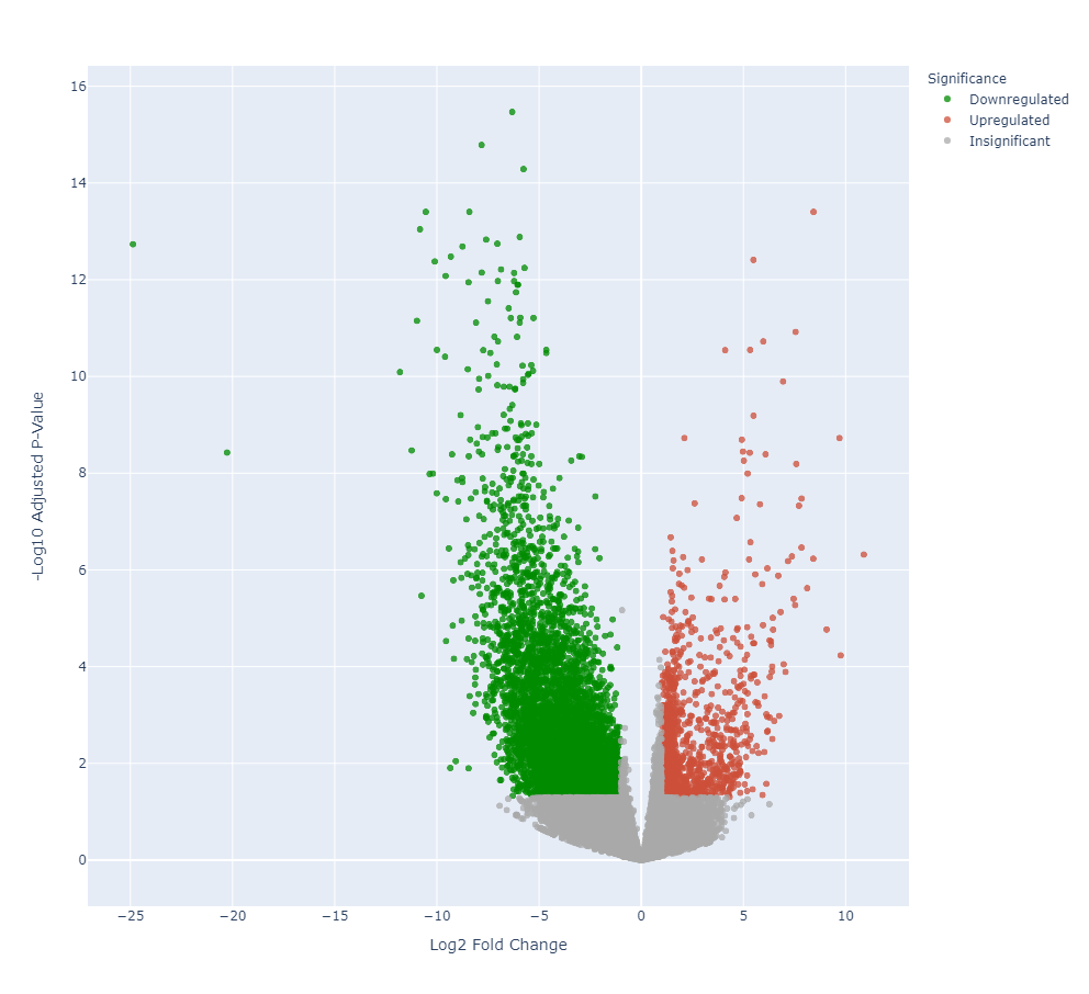 Figure 3: Volcano Plot Analysis. Log-adjusted p-values and fold change were graphed and significant genes were marked as upregulated or downregulated.